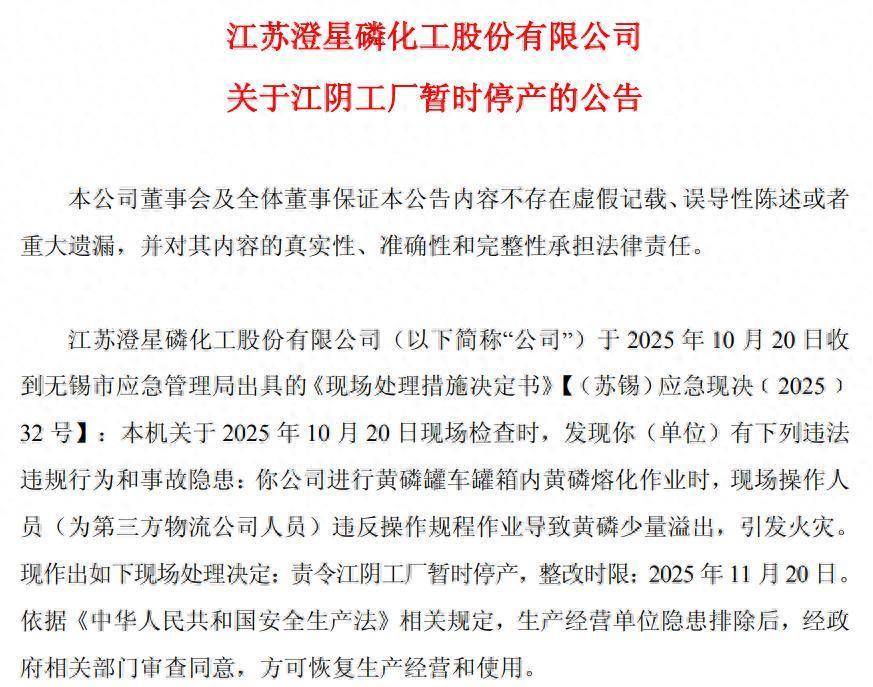 10月21日,澄星股份(600078)发布公告,因江阴工厂在2025年10月20日的现场检查中发现违法违规行为和事故隐患,公司进行黄磷罐车罐箱内黄磷熔化作业时,现场操作人员(为第三方物流公司人员)违反操作规程作业导致黄磷少量溢出,引发火灾,无锡市应急管理局责令暂时停产,整改时限至2025年11月20日。